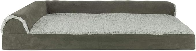 Furhaven Cooling Gel Dog Bed for Large Dogs w/ Removable Bolsters & Washable Cover, For Dogs Up to 95 lbs - Two-Tone Plush Faux Fur & Suede L Shaped Chaise - Dark Sage, Jumbo/XL