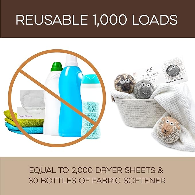 - REUSABLE FOR 1000+ LOADS ā REDUCE WASTE: Why keep buying disposable dryer sheets? These cute dryer balls last 1000+ loads, replacing 2000 dryer sheets or 30 bottles of fabric softener. Fluff Ewes dryer wool balls laundry reusable deliver a cost-effective solution for 2-4 years of hassle-free laundry. Make a smarter choice for your wallet and the environment.