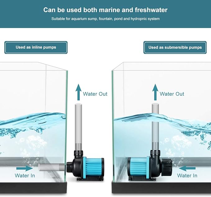 - Wide applicaion DC pump: can be used as salt water or fresh water aquarium sump pump, fountain pump,hydroponics pump and waterfall pump,used as sumbersible pump;This pump was supposed used as submersible .