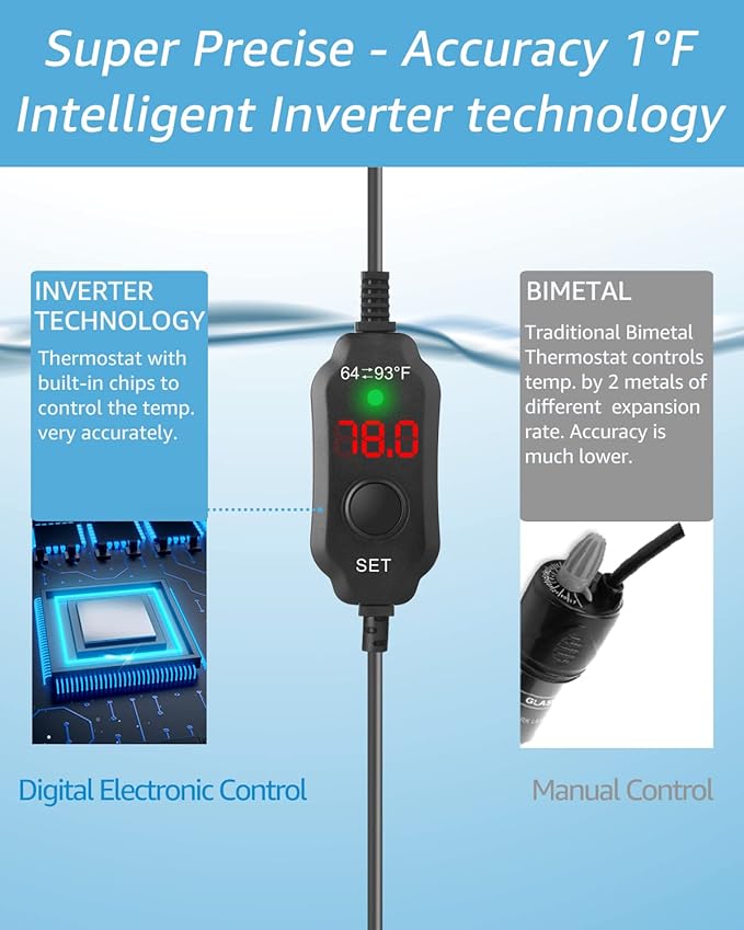 - SUPER ACCURATE 1F – Thanks to the intelligent inverter technology, with the in-built chips the thermostat keeps the fish heater at a constant temperature at an accuracy of 1F much more accurate than the traditional knob-controlled fish heaters and you save your electricity expenses by 50%!