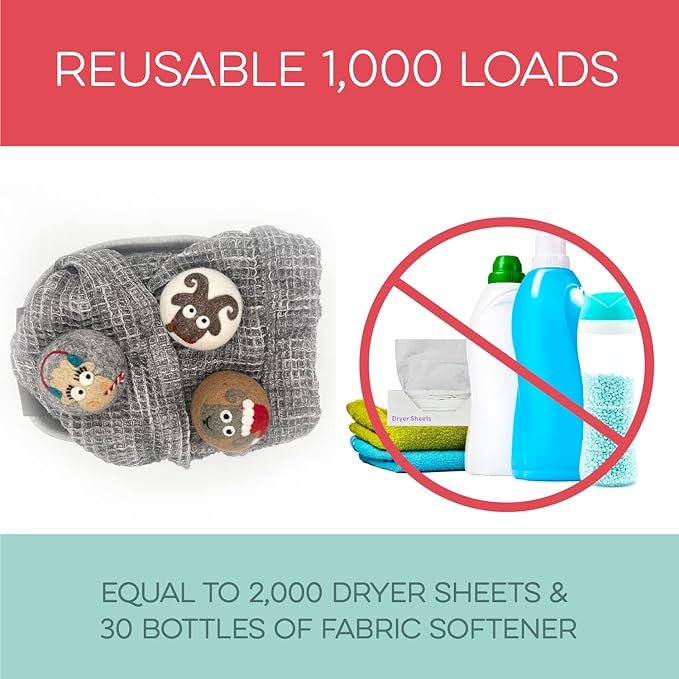 - REUSABLE FOR 1000+ LOADS ā REDUCE WASTE: Why keep buying disposable dryer sheets? These cute dryer balls last 1000+ loads, replacing 2000 dryer sheets or 30 bottles of fabric softener. Fluff Ewes dryer wool balls laundry reusable deliver a cost-effective solution for 2-4 years of hassle-free laundry. Make a smarter choice for your wallet and the environment.