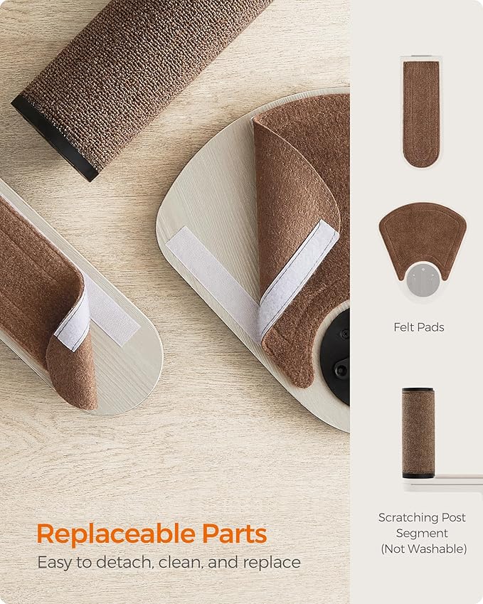 - [Replaceable Parts] The scratching post segments feature the unique Clickat structure, so it's easy to replace them with a simple pull and push. The felt pads are fitted with hook-and-loop fasteners to easily detach, replace, or clean