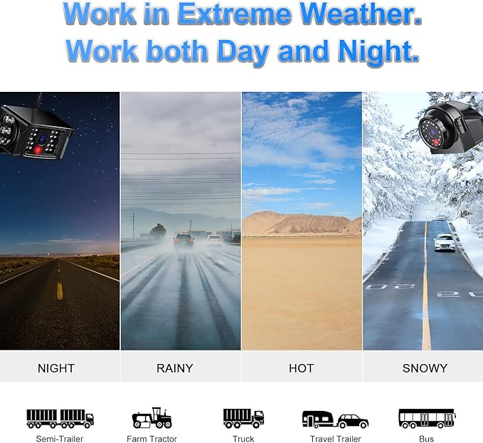 - ★ Rear & Side View Cameras with Infrared Lights: Cameras with 18 infrared lights make it possible for you to drive safely in the dark, giving you the best night vision. Featuring with high/low temperature resistance (-4℉-198℉) and IP69 Waterproof, it works perfectly in any extreme weather. (It can be applied to furrion pre-wired mount, please ask us for bracket adapter.)