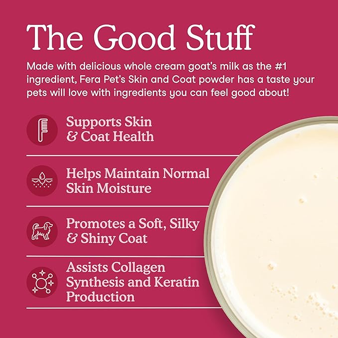 - Cat and dog skin care: Fera’s Skin & Coat goat milk topper contains collagen powder, biotin, vitamin C, plus full cream goat milk for easy digestion; our skin and coat supplement for dogs and cats also helps with coat thickness and shine