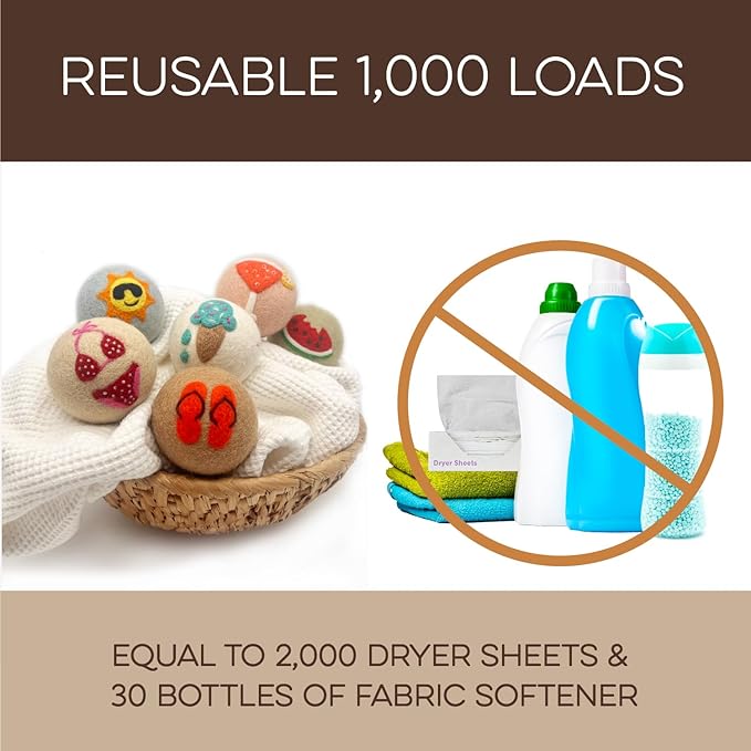 - REUSABLE FOR 1000+ LOADS ā REDUCE WASTE: Why keep buying disposable dryer sheets? These cute dryer balls last 1000+ loads, replacing 2000 dryer sheets or 30 bottles of fabric softener. Fluff Ewes dryer wool balls laundry reusable deliver a cost-effective solution for 2-4 years of hassle-free laundry. Make a smarter choice for your wallet and the environment.