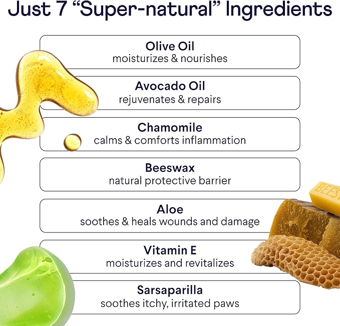 - Only 7 Super-Natural Ingredients - olive oil, avocado oil, chamomile, beeswax, aloe, vitamin E, and sarsaparilla unite to nourish, protect, and repair your pupās precious paws.