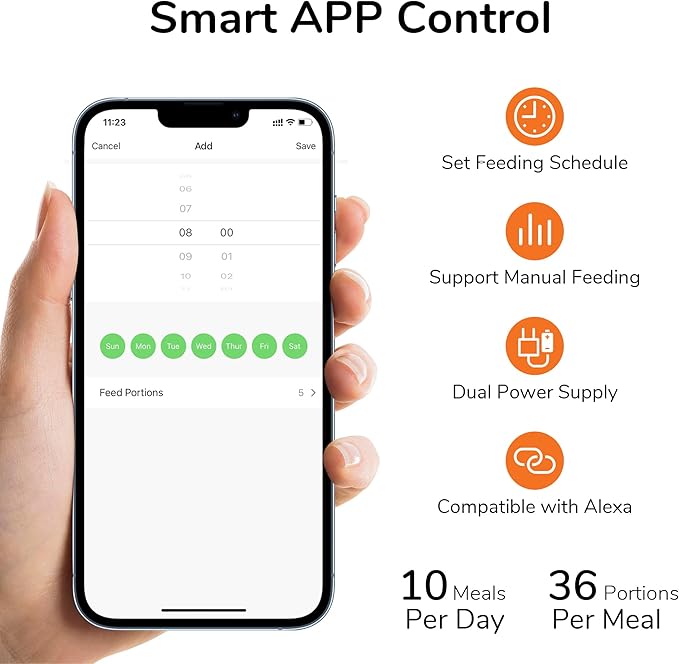 - 😸Smart APP Control - FUKUMARU automatic cat feeder supports 2.4GHz WiFi, allowing you to program and monitor your pet's diet anytime, anywhere through the Smartlife APP for iOS and Android phones. You can develop a feeding plan and schedule for your pet, with a maximum of 10 meals per day, 1-36 servings per meal, approximately 0.21-0.28OZ per portion. (Double click the button on the feeder to manually feed one portion of food)