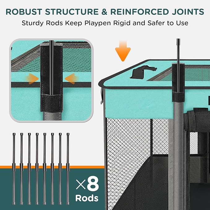 - Safety & Durability: Kitten playpen is made of high-quality 600D Oxford cloth, which is wear-resistant, soft to the touch, and odorless. We have reinforced the joints and corners of the dog playpen to ensure the safety of your pet. (The portable pet playpen is lightweight, and you can place heavy objects inside the pet playpen to increase stability, but it is not suitable for use with aggressive pets)