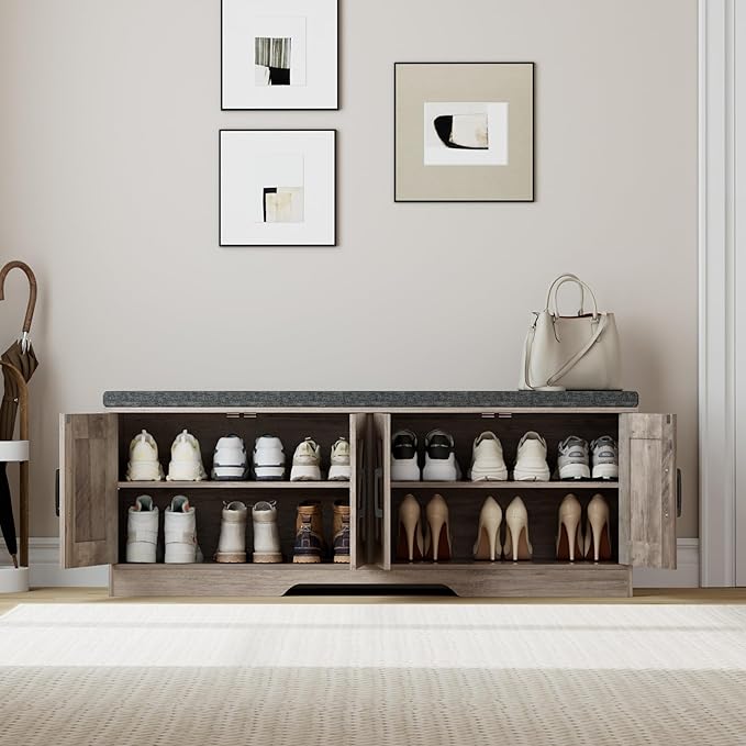 2-Tier Storage Bench, Shoe Bench with Padded Seat Cushion, Entryway Bench with 4 Barn Doors, Adjustable Shelf, 13.8" D x 47.2" W x 17.7" H, for Entryway, Living Room, Bedroom, Greige