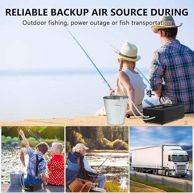 - AC/DC Automatic Switching: This upgraded lithium battery-powered air pump is compatible with both AC and DC power sources. This air pump functions as a regular air pump when plugged into AC power, and automatically switches to DC power from the lithium battery during power outages, ensuring uninterrupted oxygen supply for your fish tank