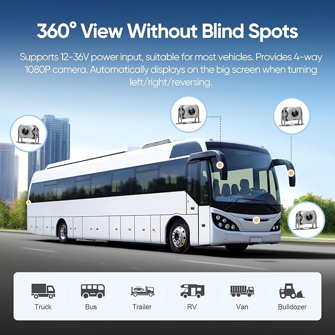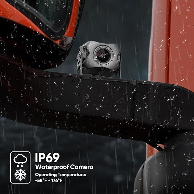 - 4 IP69 rated waterproof metal cameras: With a wired connection, the signal transmission is more stable and the picture quality is clearer.Equipped with a special bracket, you can freely adjust the shooting angleļ¼The camera of backup camera system is constructed with aluminum alloy housing, IP69 level waterproof, high temperature resistant, cold resistant, and can work stably in extreme weather such as rain and snow.