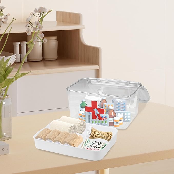 - 2.Double Layer Design-The first aid kit is designed with insert divider tray to store scattered drugs, thermometer, cotton bud, bandages, ointments, wipes, swabs, tweezers, and more. Neat and clear, easy to find. The lower layer can be placed the big bottle and is big enough to store various specifications drugs. Classify your pills with the 3 compartments dividers. This medicine box holder divider is removable.