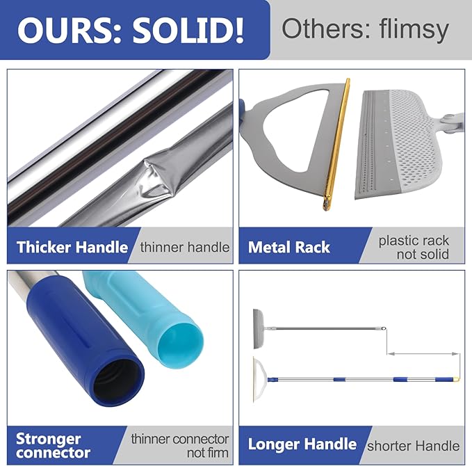 - 54" Ergonomic Handle with Thicker Poles: Designed with user comfort in mind, the 54” long handle and much thicker stainless steel poles of the pet hair broom allows for an upright position while raking, minimizing back strain and making it suitable for users of all heights.