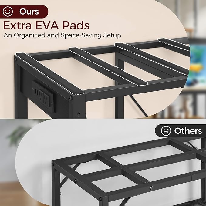 - Stable and Robust: Constructed with sturdy metal and premium engineered wood, the aquarium stand with power outlets has 6 adjustable feet with an X-brace for enhanced stability, holding up to 400 lb. The EVA-padded top protects your aquarium and prevents scratches