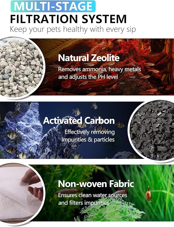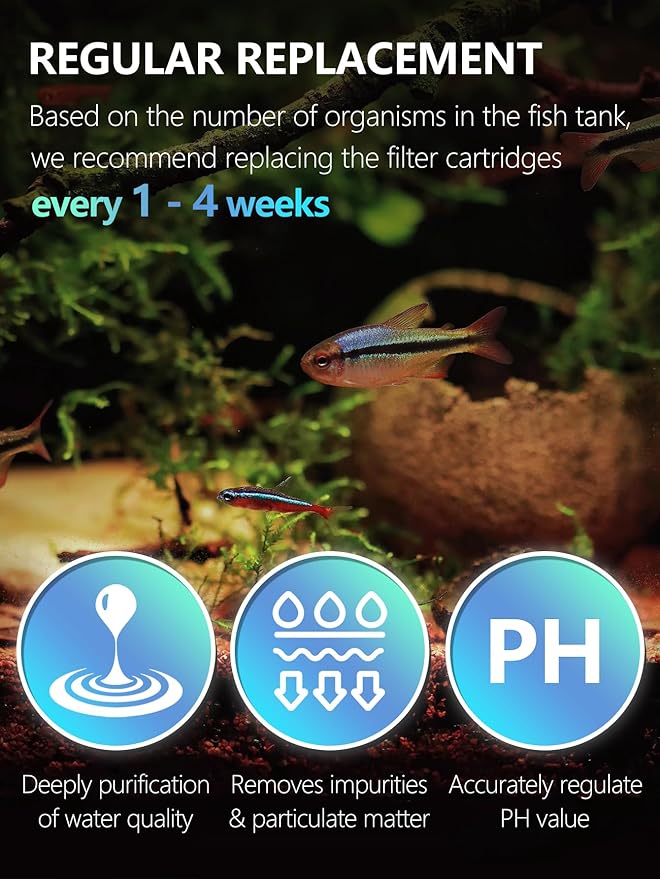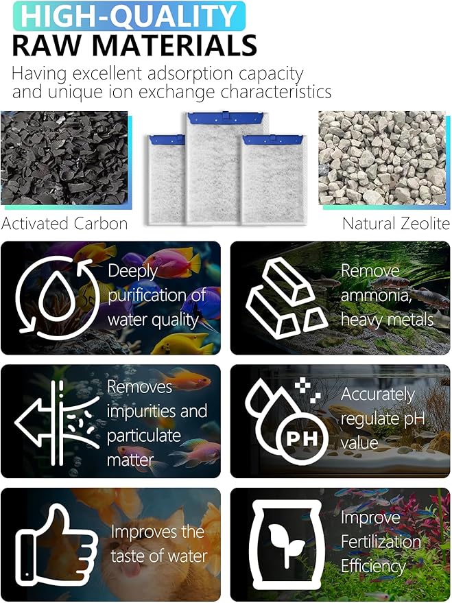- Multi-stage Filtration:Made with premium coconut shell carbon and natural zeolite, the fish filter cartridge delivers exceptional cleaning—removes impurities, particles, ammonia, and heavy metals. It runs quietly for undisturbed aquatic life
