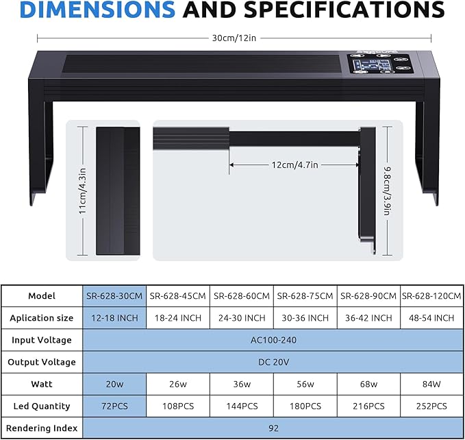 - 3 Customizable Modes – DIY (8 programmable segments), Day/Night (20-level WRGB dimming), and Preset Cycle (sunrise/daylight/sunset/moonlight) for perfect aquarium lighting