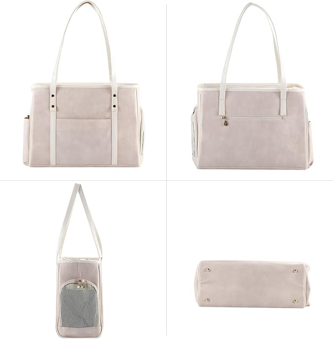 Fashion Dog Carrier Purse, Premium Leather Cat Carrier Bag, Airline Approved Soft Sided Pet Travel Tote Bag with Pockets Beige