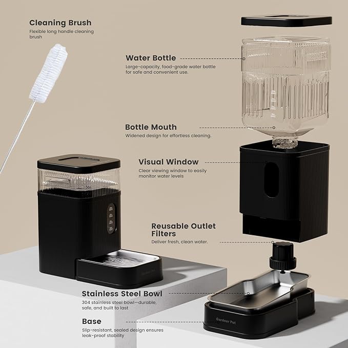 - Premium Pet-Safe Materials - Gardner Pert dog water bowl dispenser comes with 304 stainless steel bowl + cleaning brush guarantees a safe, easy-to-clean water supply for pets.