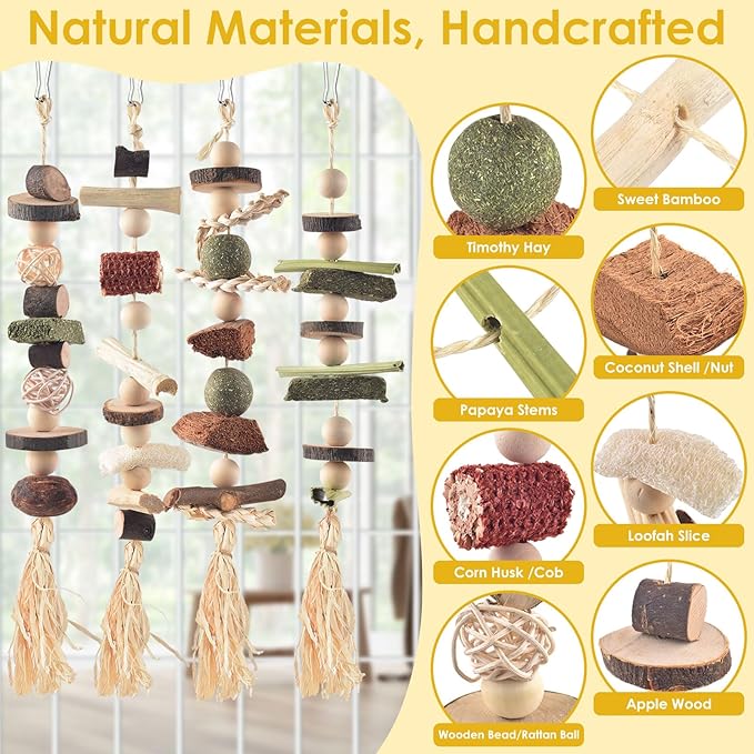 - Bunny Toy Set: DBNESS 4pcs rabbit toys are crafted from 100% natural materials including apple wood, timothy hay, loofah slices, rattan balls, nuts, corn husks/cobs, coconut shells, sweet bamboo, and papaya stems. Bunny chew toys for rabbits provide safe play and chewing opportunities for your lovely pets. These materials are not only fiber-rich, which helps clean your pet's teeth and promote digestion, but they also aid in exercising and relieving stress