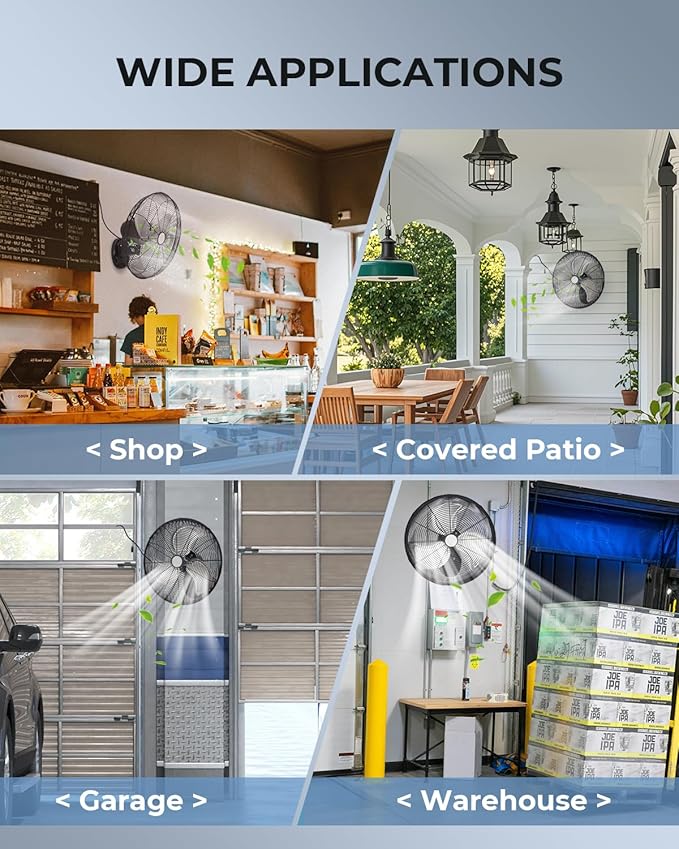 - High Velocity Airflow: Engineered with three adjustable speed settings (3800/4900/6000 CFM) , this 20 inch industrial wall mount fan delivers maximum airflow up to 6000 CFM. Ideal for indoor large spaces like industrial, commercial, warehouses, workshops, garages, shop, barn, covered patios, and factory.