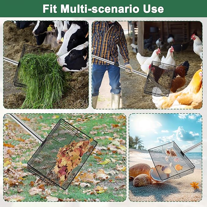 - 🐓 [Widly Use Extra-wide Sifter Shovel] This chicken coop sifting shovel can be used for large-scale cleaning work, It can also be used as aleaf cleaning shovel, beach sand shovel, horse/cow/sheep poop scooper, etc. Whether you are using it for a small backyard or a large farm, this sand sifter shovel will do the job.