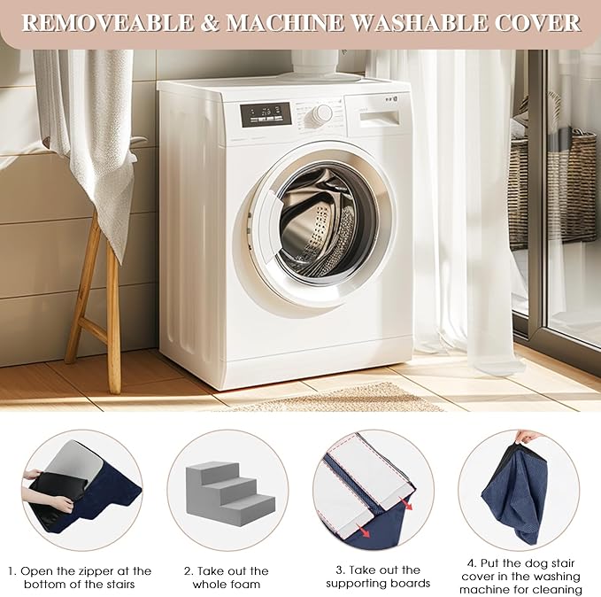 - 【EASY TO CLEAN】 When used for the first time, no assembly is required. After opening the package, allow 48 hours for the stairs foam to rebound. When clean it, just take out the foam and supporting boards. The removable cover is machine washed. Please do not wash the foam to retain shape and support.