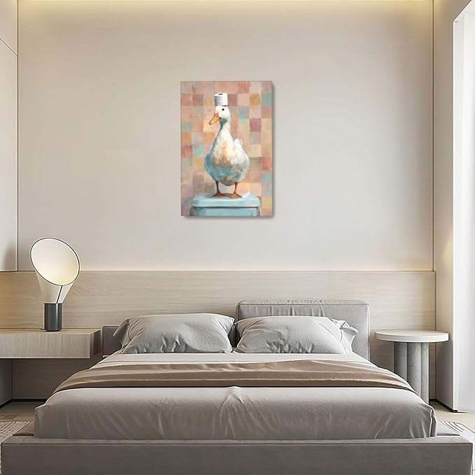 Funny Duck Bathroom Wall Art Cute Duck on Toilet Canvas Wall Decor Funny Quirky Farm Animal Pictures Painting Print Framed Artwork Decorations Gifts for Bathroom 16"x24"