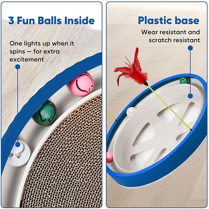 - 3-IN-1 DESIGN: Features a cardboard scratching surface, rolling ball track with colorful balls, and two interactive feather toys for maximum feline entertainment