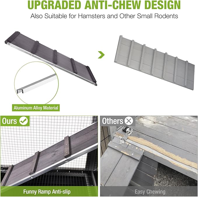 - CHEW-PROOF RAMP FOR RABBITS: The ramp features aluminum edges to prevent destructive chewing, while its slip-resistant surface ensures stable, secure hopping. Your bunny can move between levels confidently without risk of slips or damage to the hutch